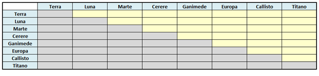 A questo punto è facile “leggere” il calendario ottenuto. Per esempio, la prima giornata sarà composta dalle partite corrispondenti alle caselle riempite con un 1: Terra-Luna, Marte-Callisto, Europa-Cerere e Titano-Ganimede. Come potete vedere, il risultato è diverso, già nella prima giornata, da quello prodotto dall’algoritmo di Berger. Questo non deve sorprendere, anzi. Con un numero di squadre appena un po’ grande, come 8, sarebbe infatti molto strano che due diversi approcci generassero calendari identici.